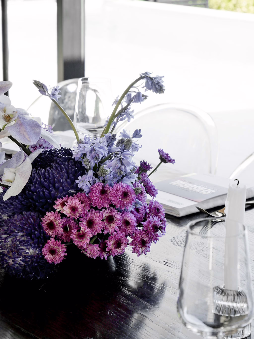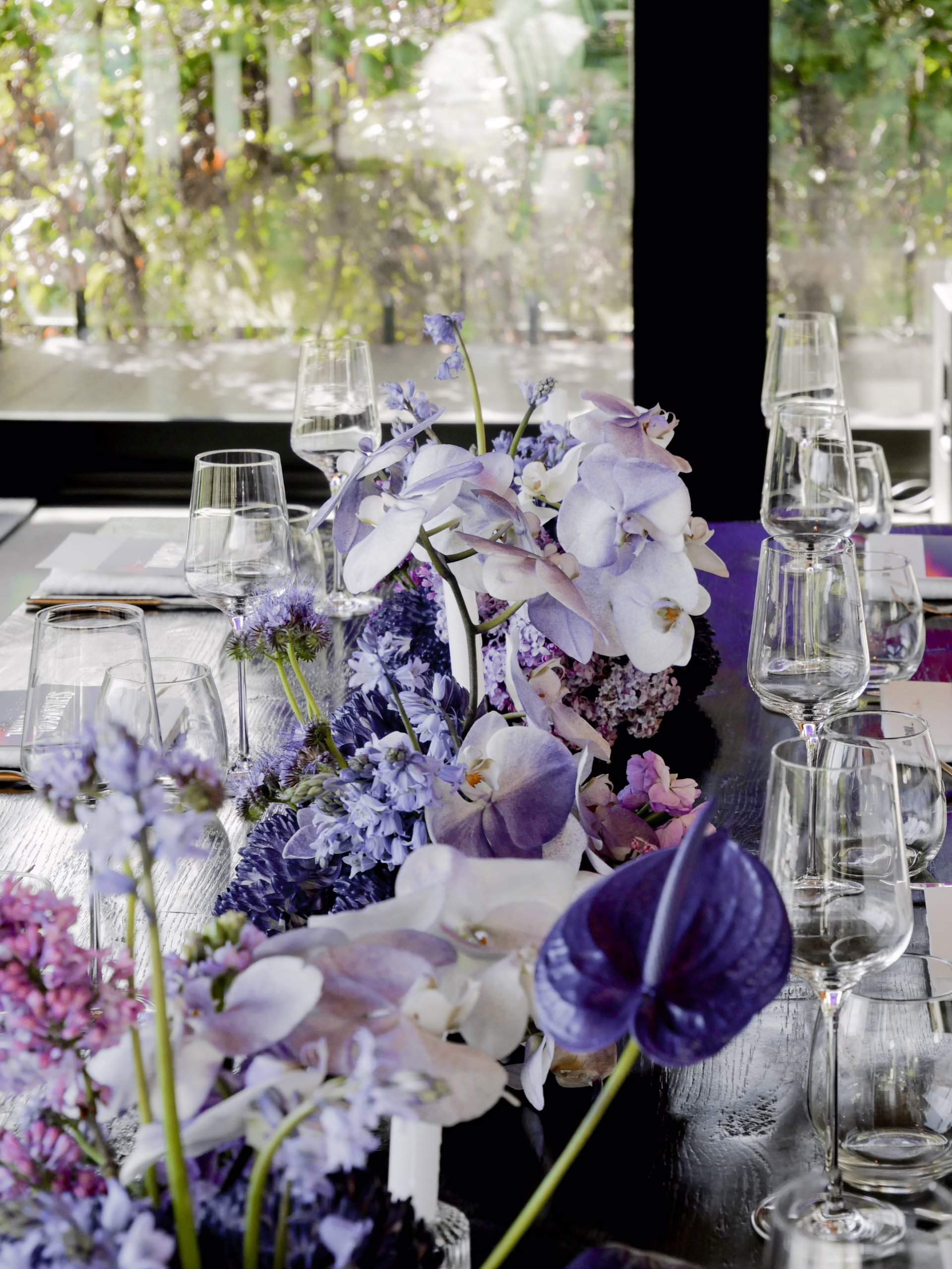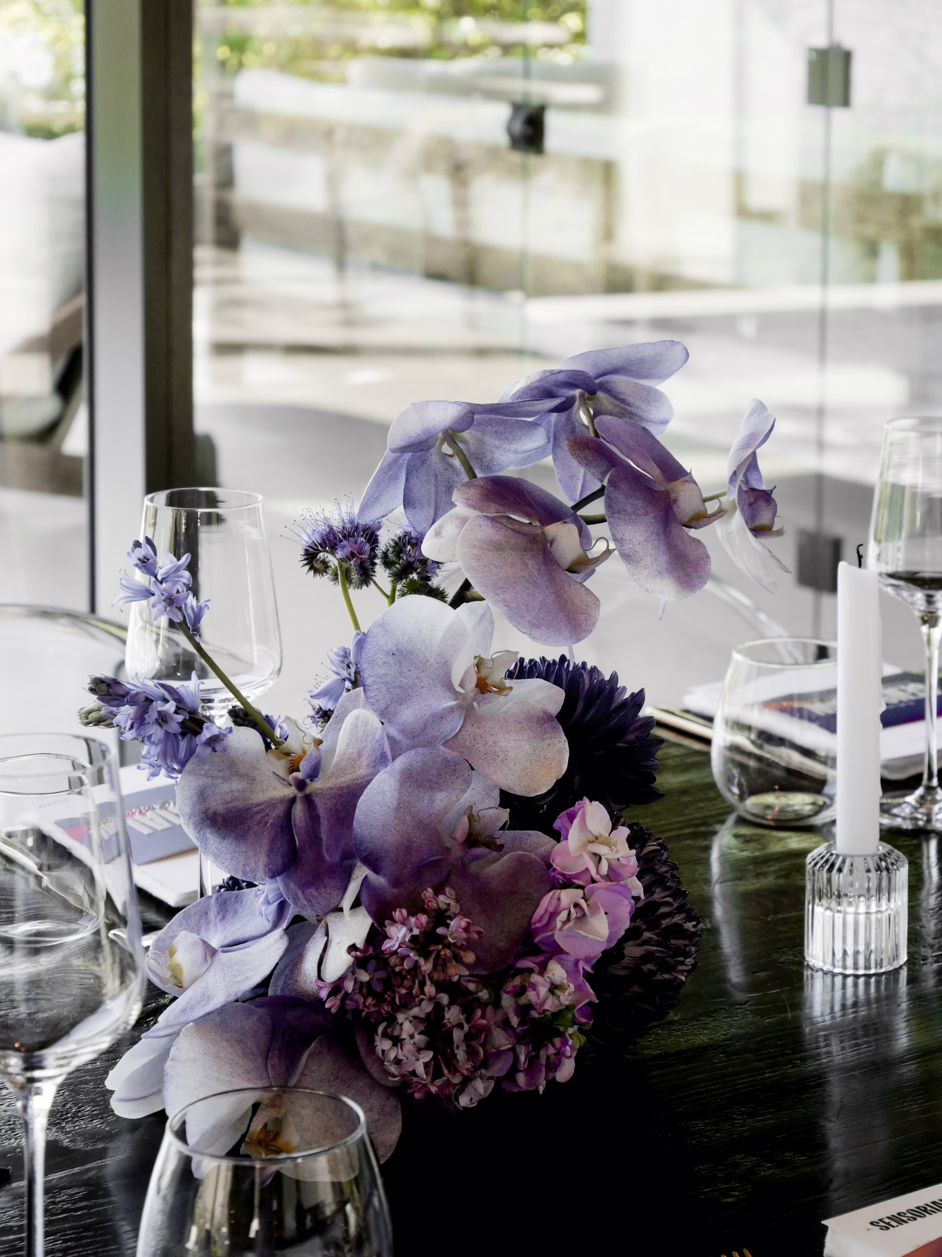 For Cadbury’s executive dinner, we drew inspiration from the iconic Dairy Milk purple, reimagining it through a refined floral palette. Layers of lilac and Stock brought softness and fragrance, while  Snow Down Chrysanthemums were sprayed to capture that famous signature rich hue. To elevate the setting with a sense of theatre, sculptural phalaenopsis orchids were also sprayed purple, creating a striking focal point.