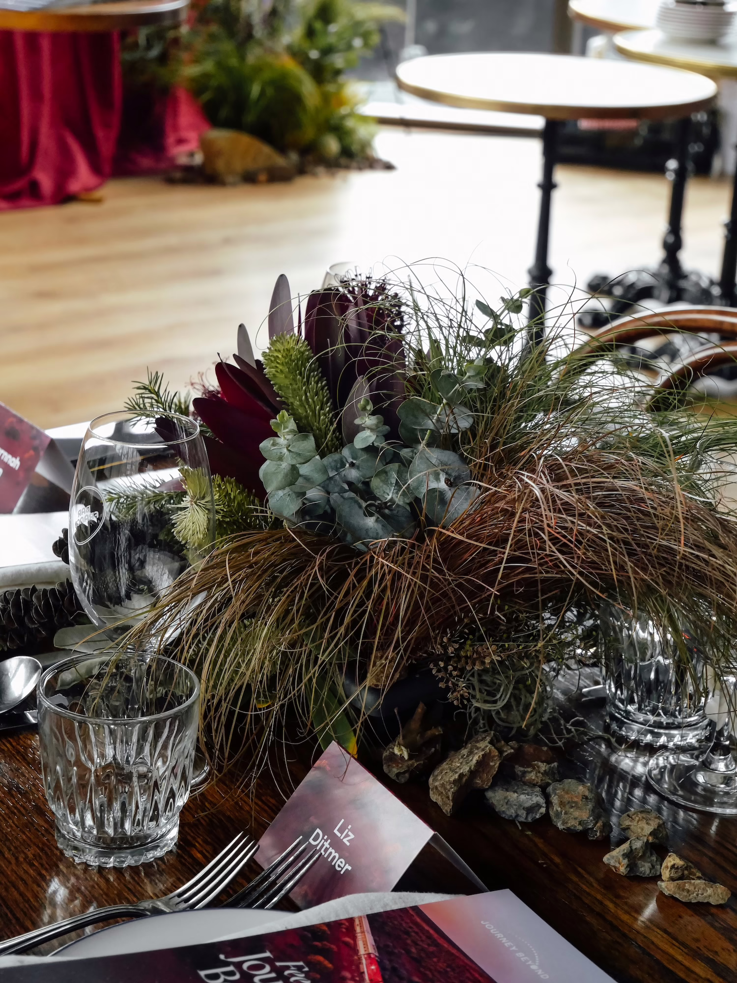 Florals were carried through from welcome signage to the bar and onto the tables, creating a cohesive look that felt considered but not overworked. Low table settings kept things relaxed and social, while the native elements added a strong sense of place and character.