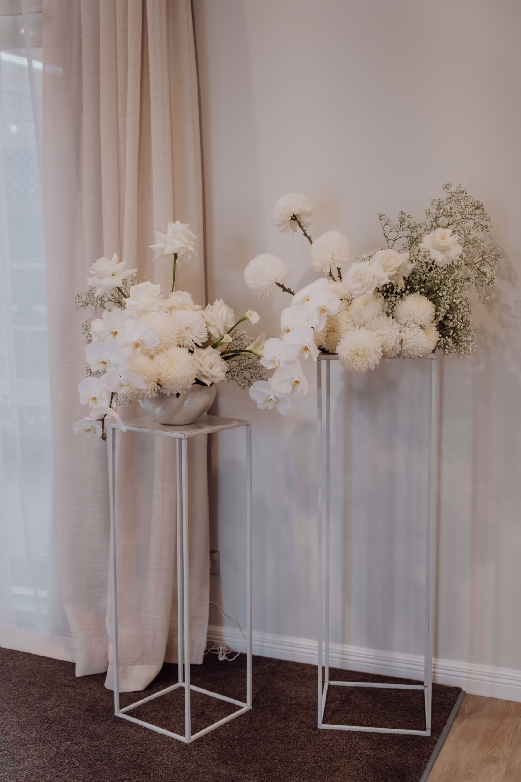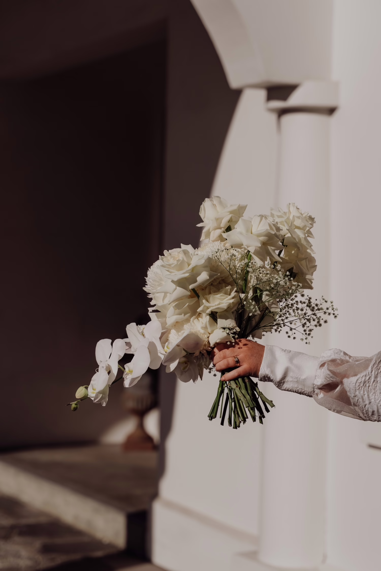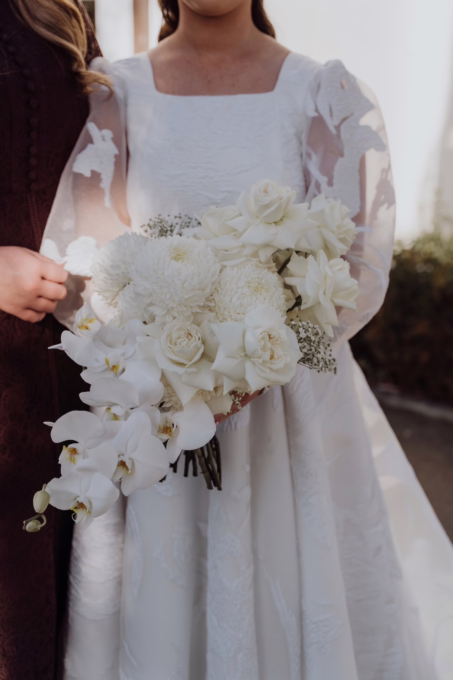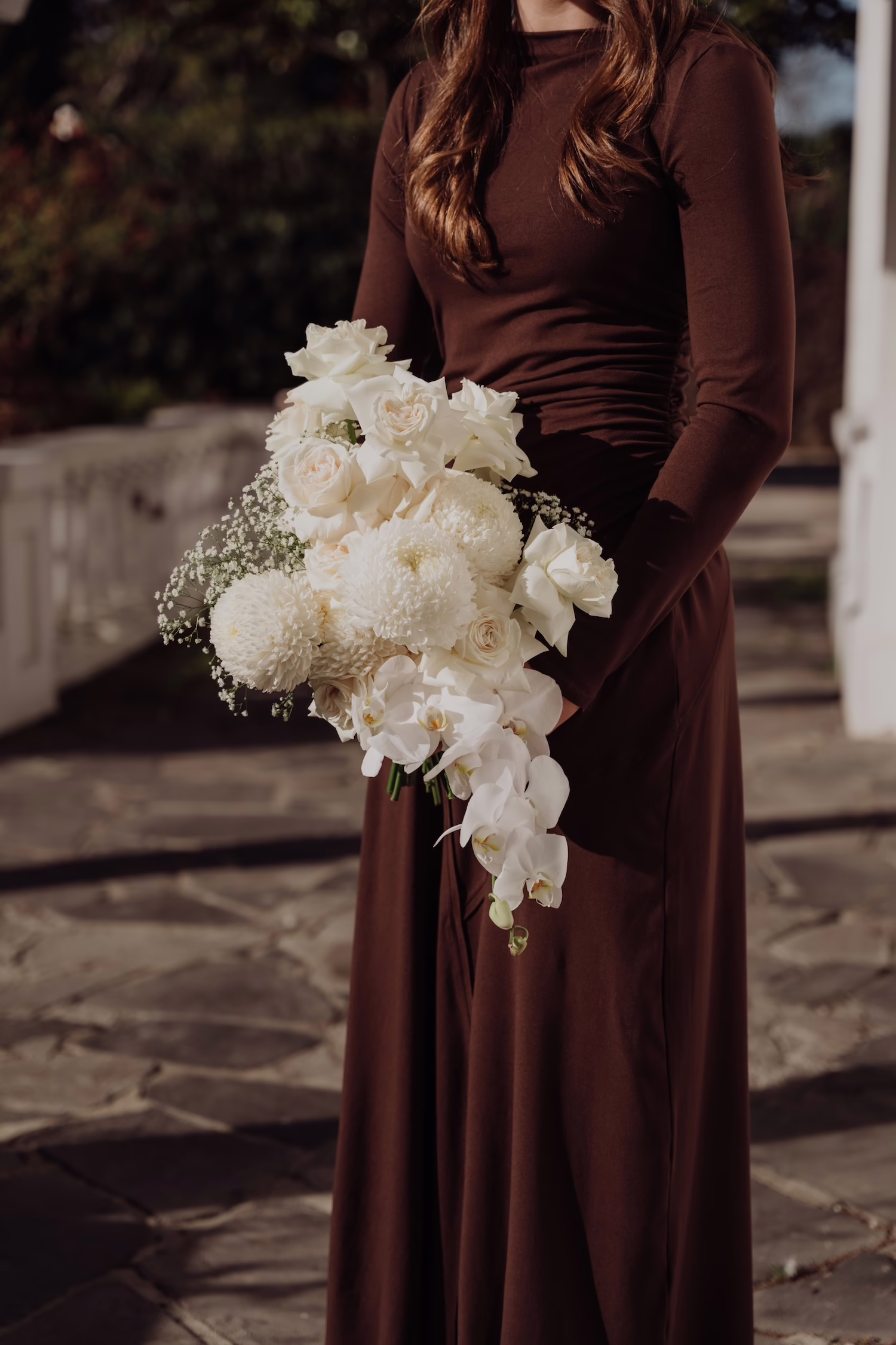 For Roxie’s winter wedding, we created florals that were white, abundant, and effortlessly classic. Her bouquet was a lush gathering of soft white blooms, full of texture and movement – think Roses, Snow down Chrysanthemums, Phalenopsis Orchids and Gyp, while her bridesmaids carried single stems of reflexed white roses, simple, elegant, and perfectly understated.
