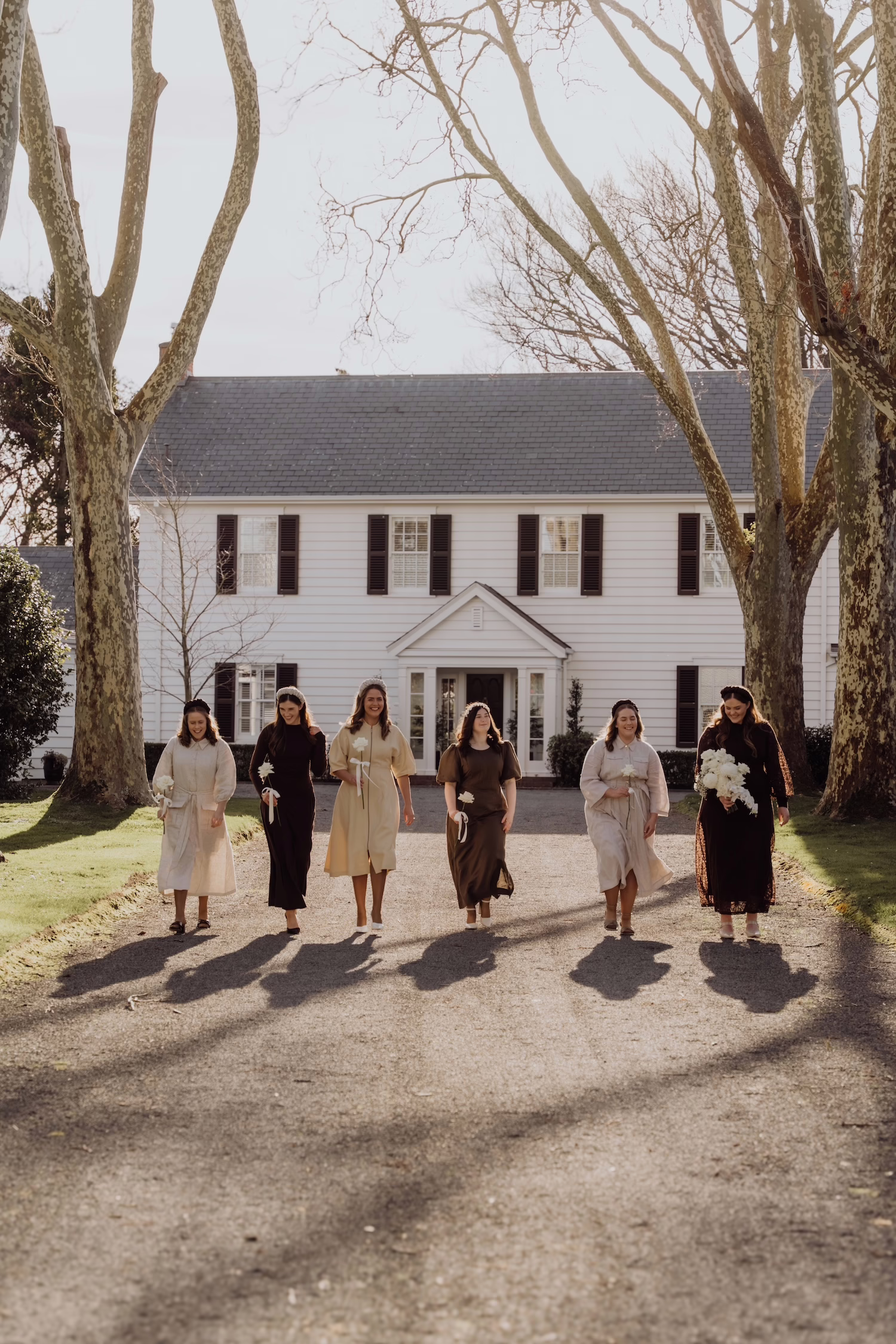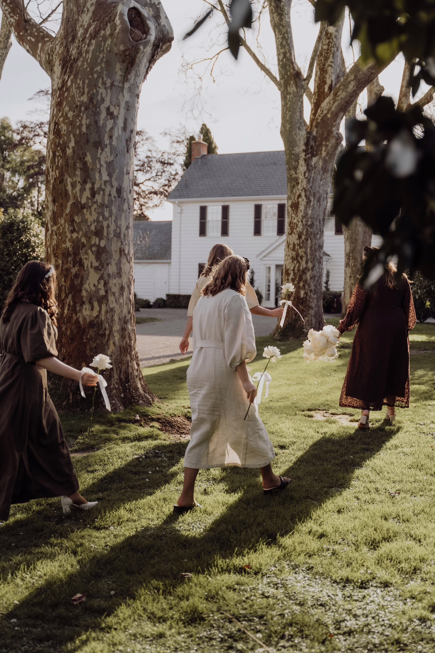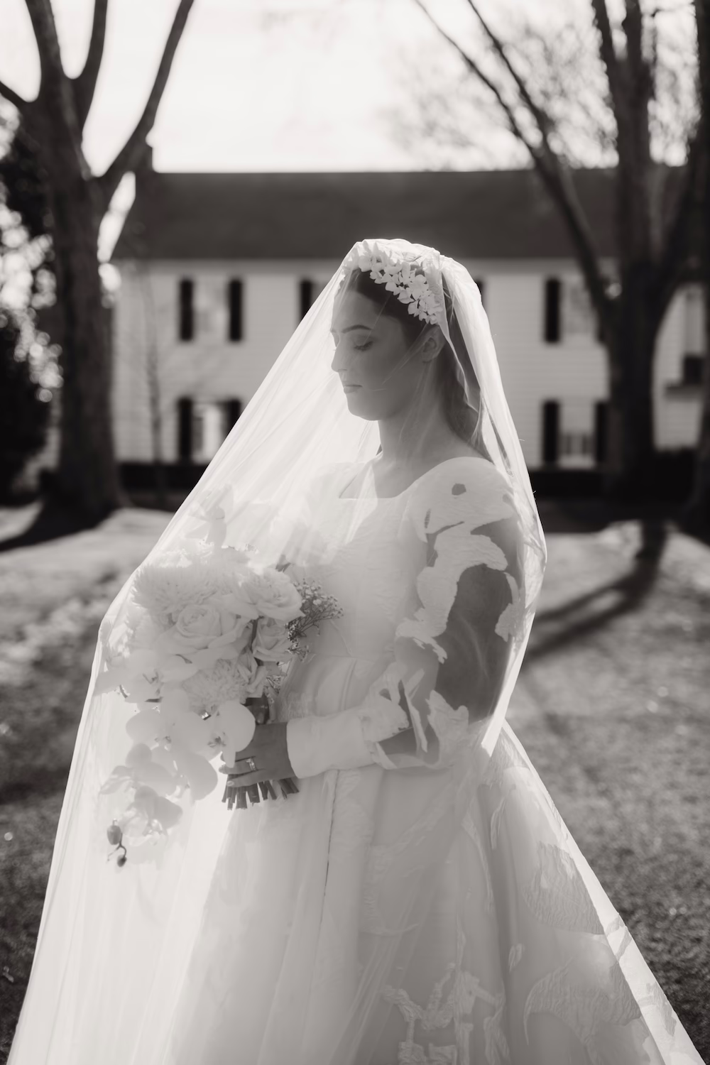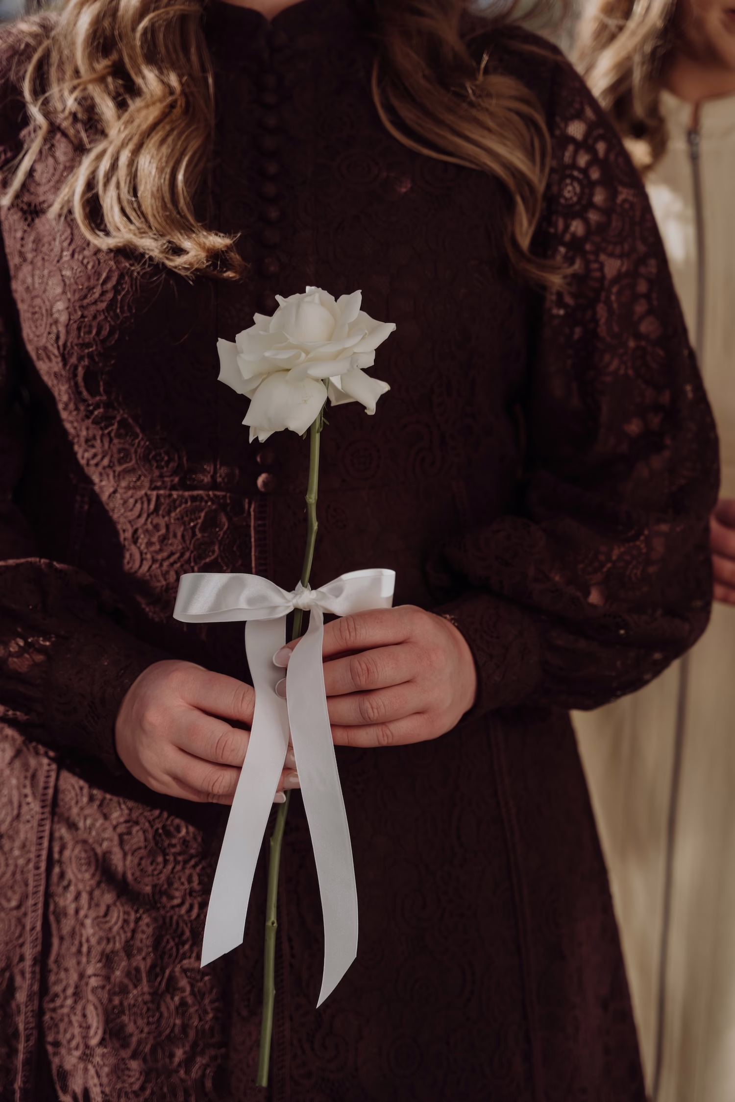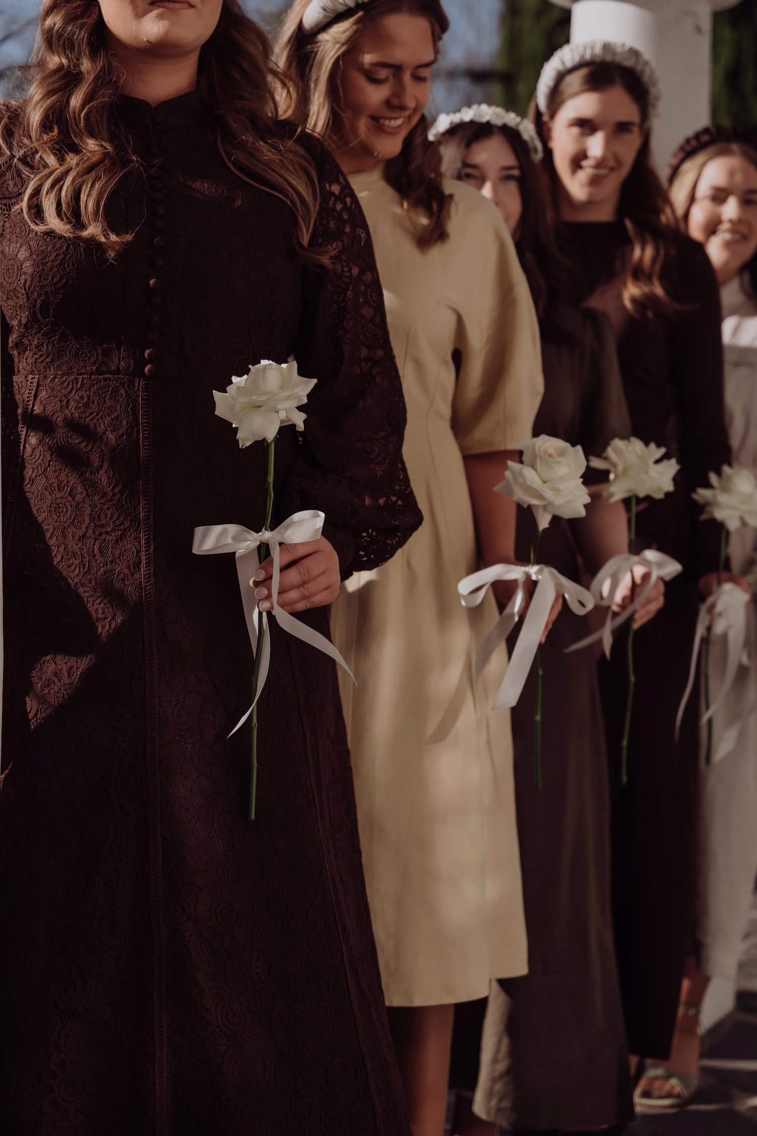 For Roxie’s winter wedding, we created florals that were white, abundant, and effortlessly classic. Her bouquet was a lush gathering of soft white blooms, full of texture and movement – think Roses, Snow down Chrysanthemums, Phalenopsis Orchids and Gyp, while her bridesmaids carried single stems of reflexed white roses, simple, elegant, and perfectly understated.