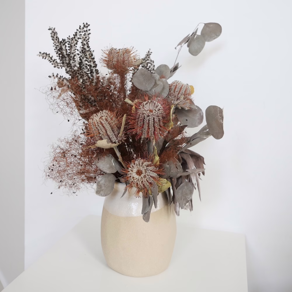 Arrangement with Dried Banksia, Preserved Eucalyptus Populus and Smokebush in 20cm ceramic vase.