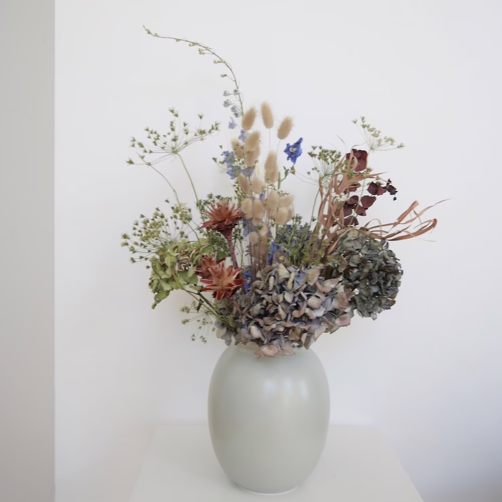 Arrangement with Dried Hydrangeas, Bunnies, Queens Anne Lace and Preserved more in 20cm grey/greeny ceramic vase.