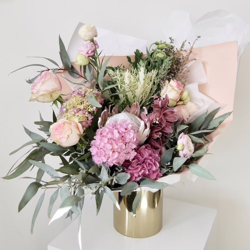 Beautiful fresh floral arrangement with pastel pinks full of seasonal blooms created by our florist. Images pictured is our Abundant Bouquet.