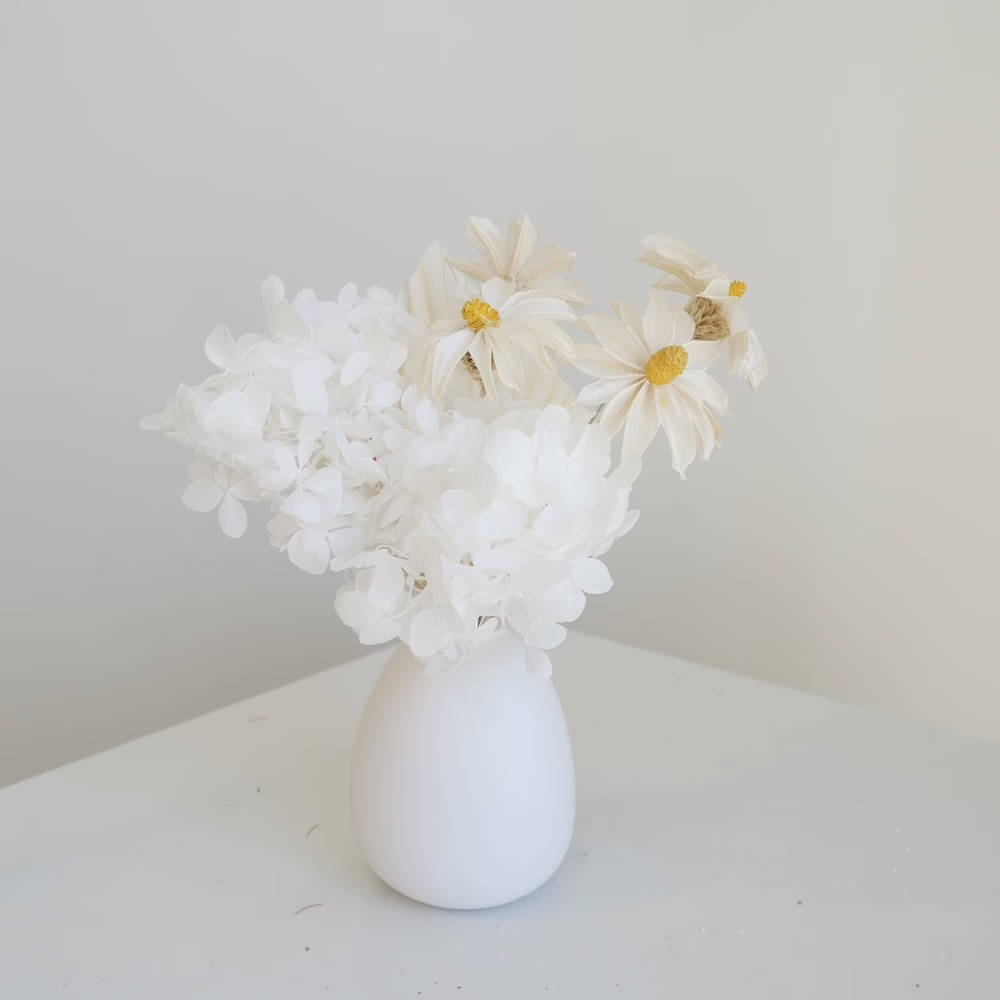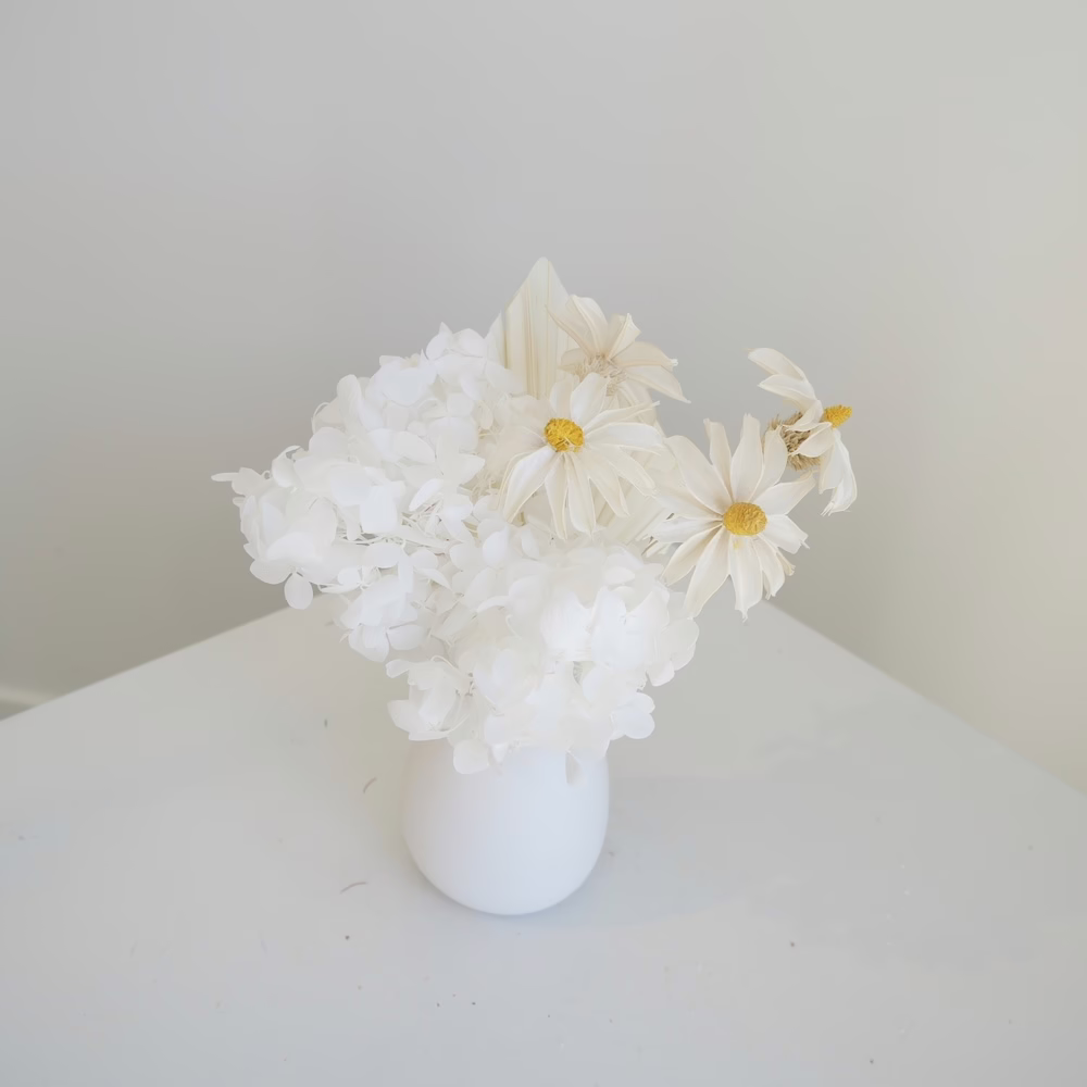 Preserved Hydrangea, Handmade Daisies and Palm in 8cm ceramic white vase.