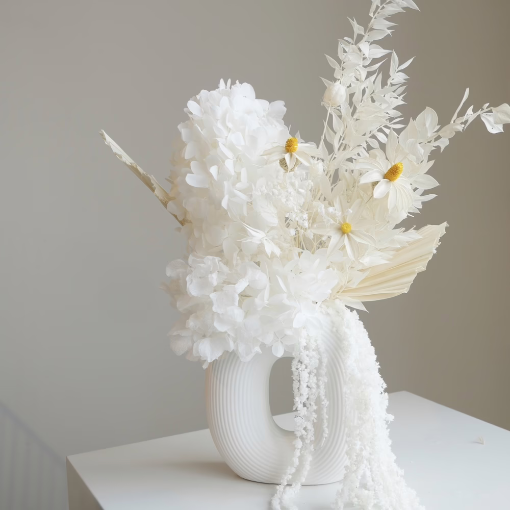 Preserved Hydrangea, Ruscus, Amaranths and palm in 20cm ceramic round vase with handmade daisies.
