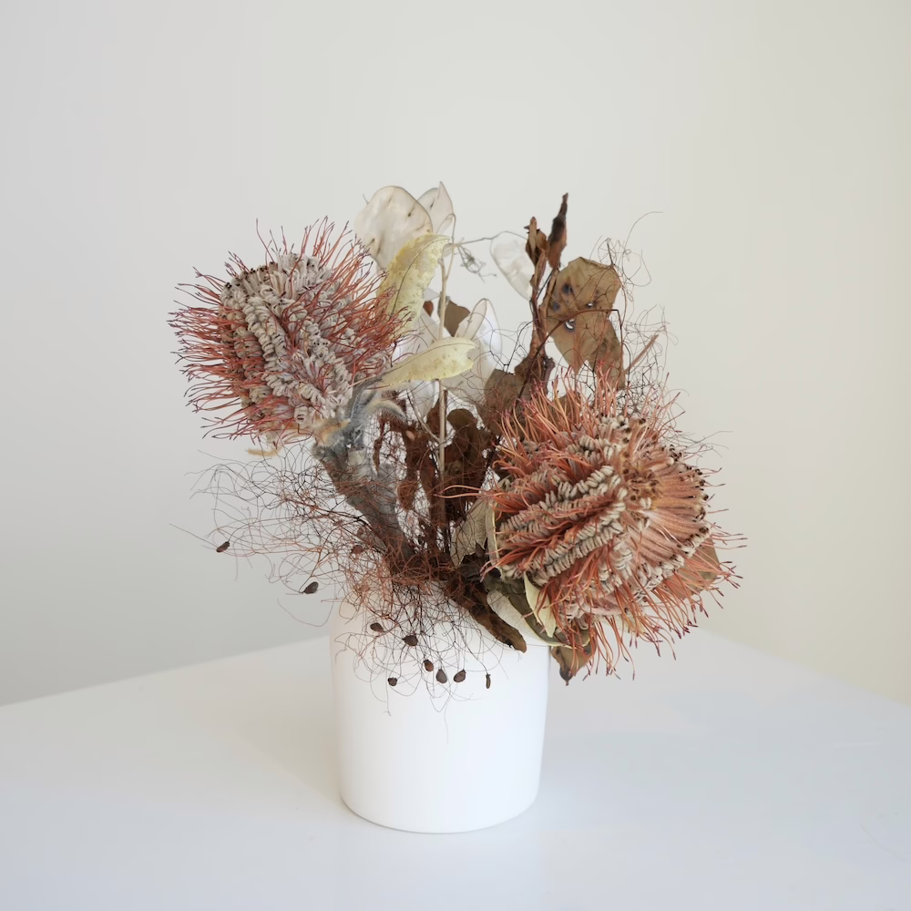 Mixed flowers including banksia, Smokebush and Honesty in 8cm ceramic white vase.