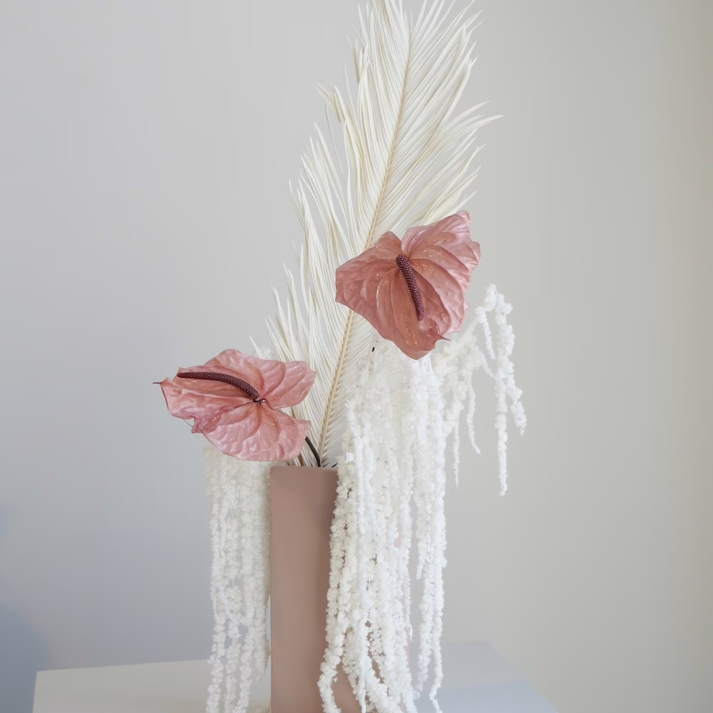 Preserved Anthuriums in 2ocm ceramic vase with Amaranths and Palm.