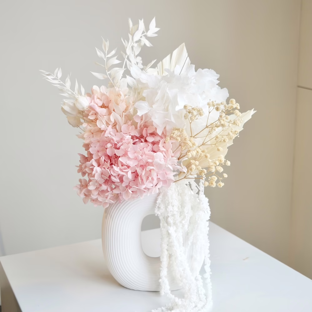 Preserved Hydrangea, Ruscus, Amaranths and palm in 20cm ceramic round vase.