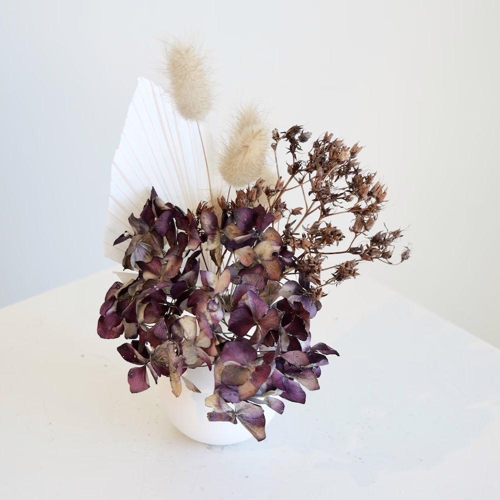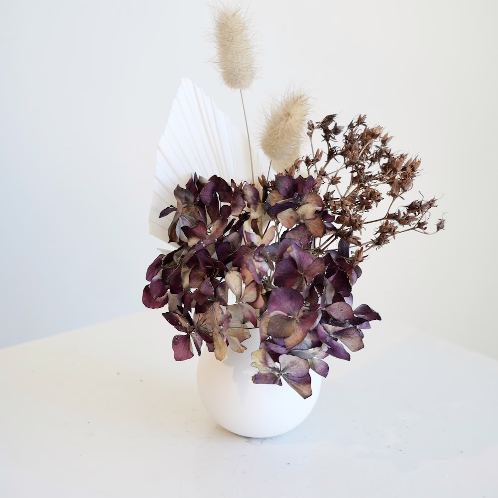 Dried Hydrangea in 8cm ceramic vase with grasses, bunnies and palm