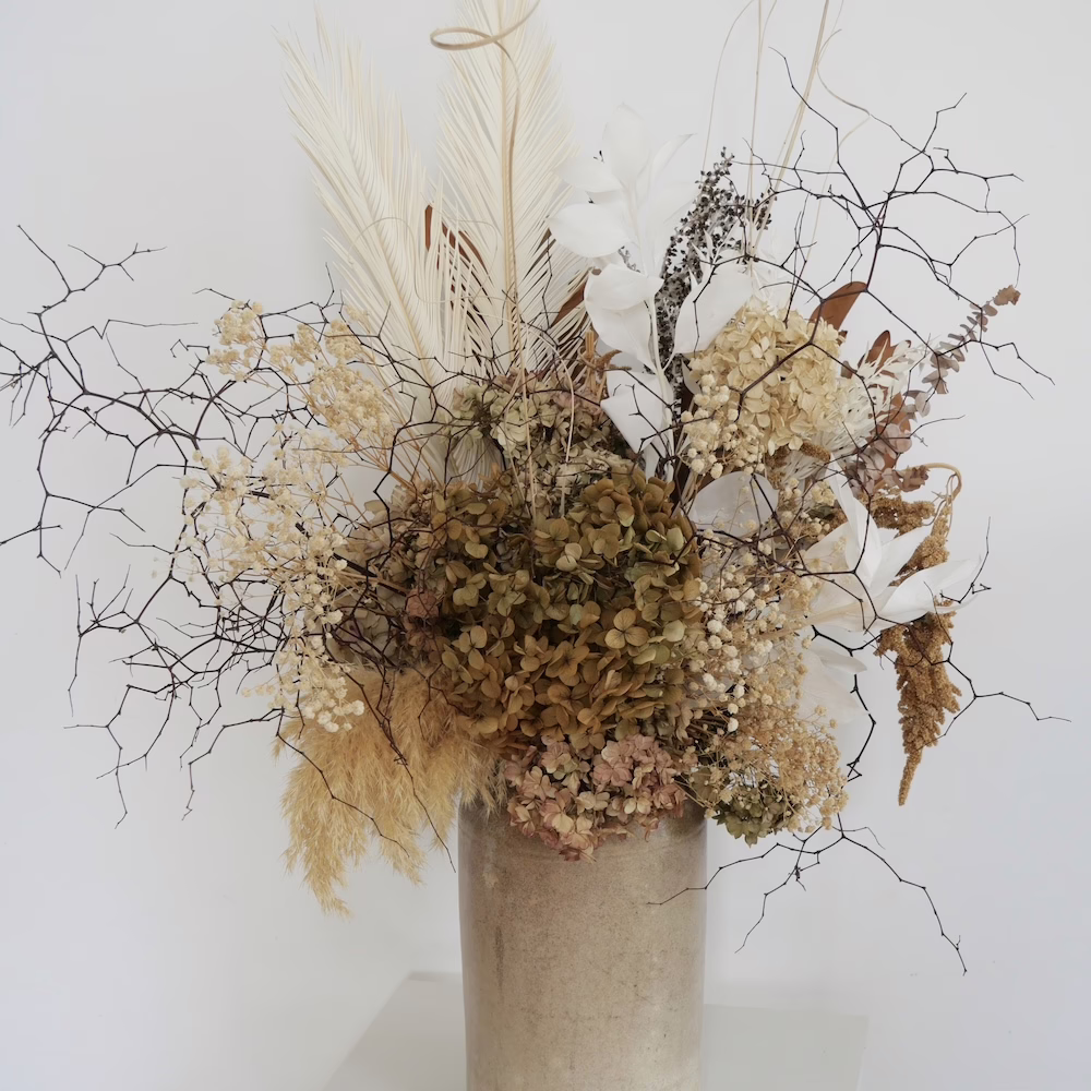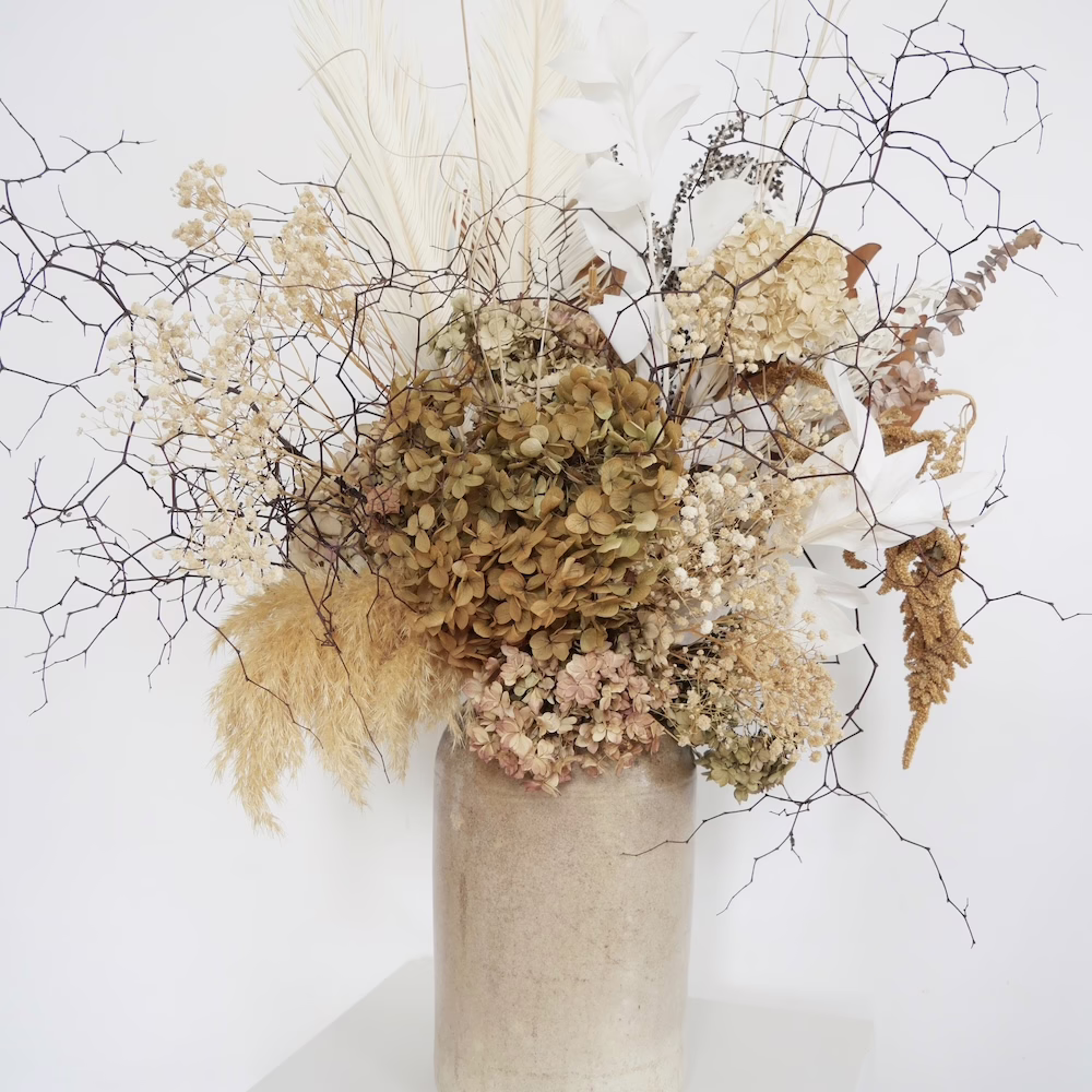 This is a spectacular large arrangement with dried and preserved hydrangea, Toi Toi, Ruscus, Euc and Draping Amaranths and more in 30cm vintage ceramic vase.