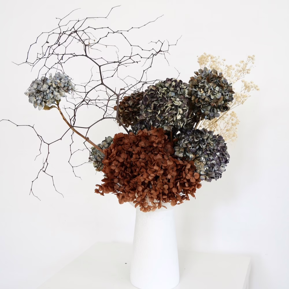 Arrangement with Dried Hydrangeas, Preserved Hydrangea, Gyp and Mulenbekia in 20cm white ceramic vase.