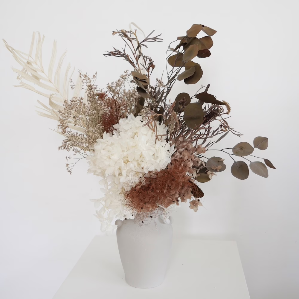 Arrangement with Preserved Hydrangea, Limonium, Preserved Palm and Grevilia in 20cm grey ceramic vase.