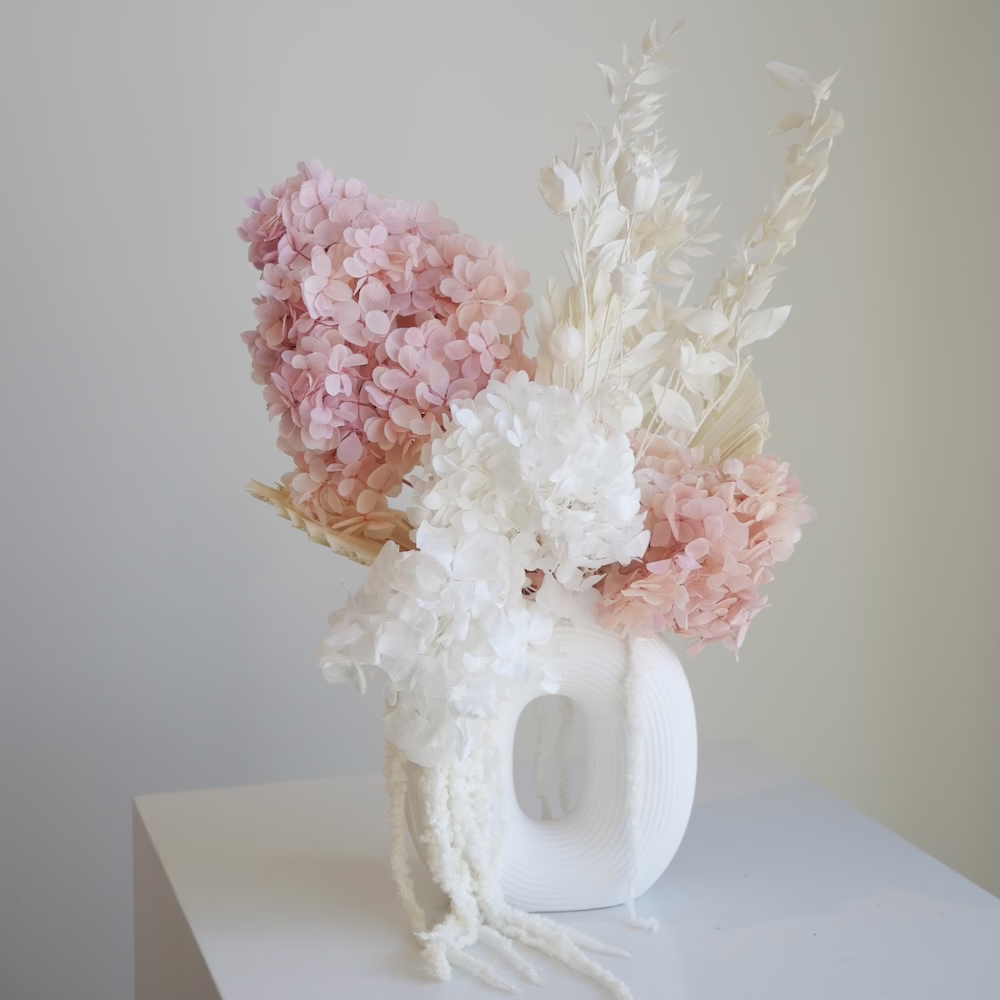 Preserved Hydrangea, Palm, Amaranths, Nigella, Ruscus in 20cm textured vase.