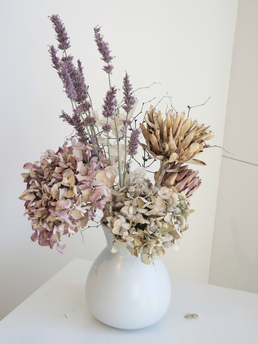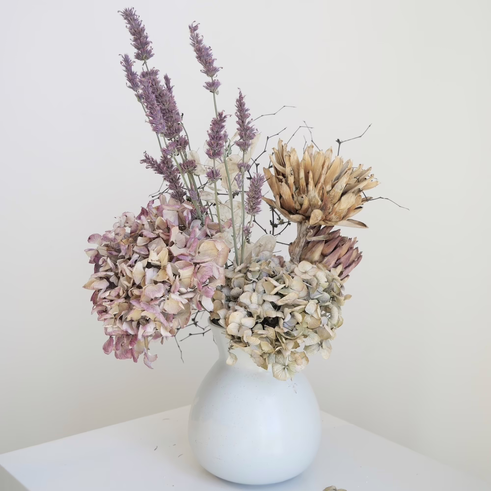 Modern Arrangement of Dried Protea, Hydrangea, Mulenbekia and Honesty.