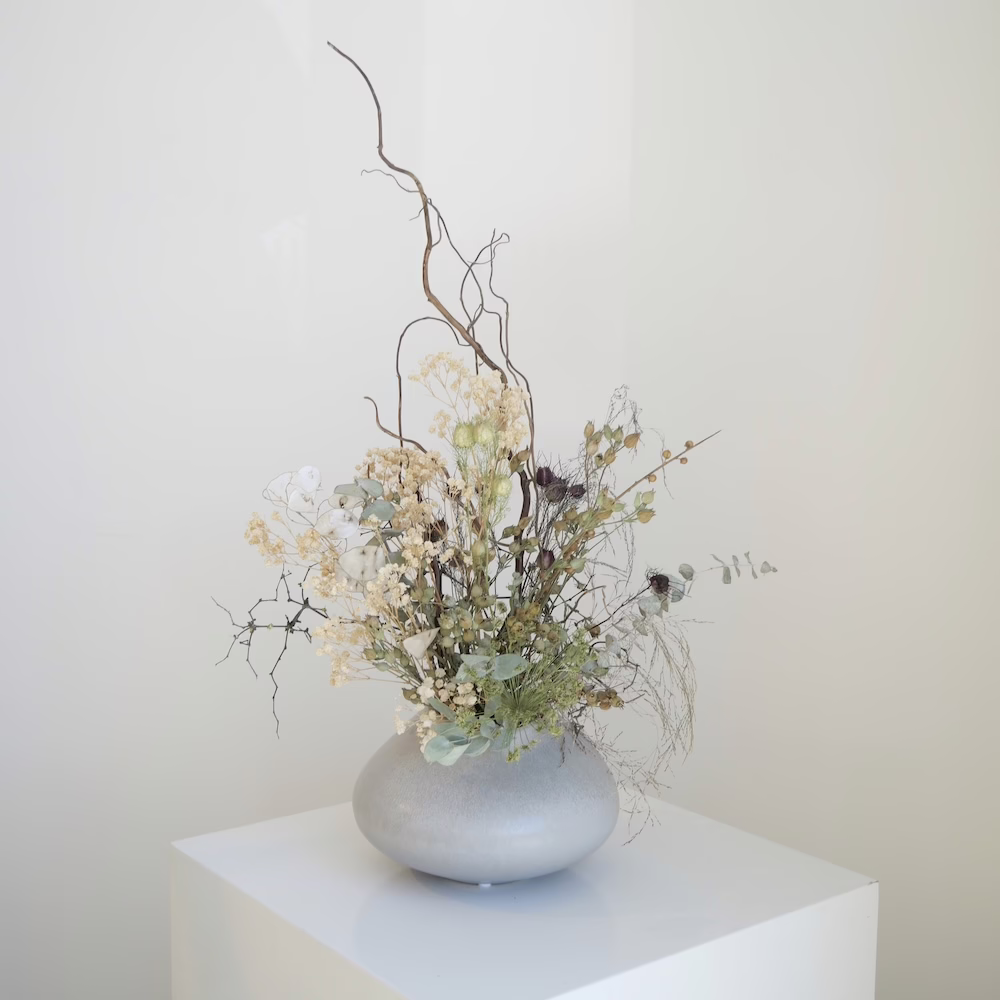 Grasses, Gypsophila, Willow and Nigella with grasses in 15cm grey ceramic vase.