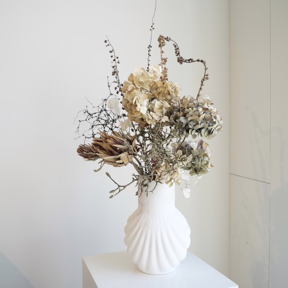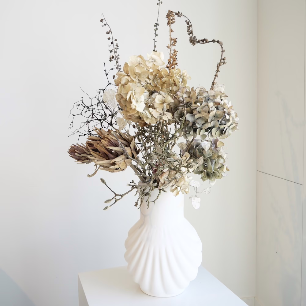 Large Sculptural Arrangement of Hydrangea, Dried Artichoke and Mulenbekia in Tall Ceramic 35cm vase.