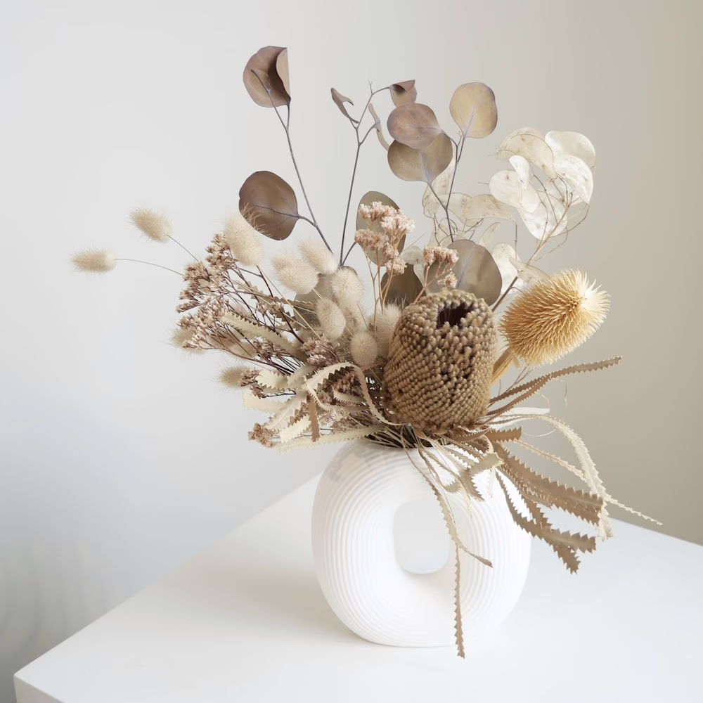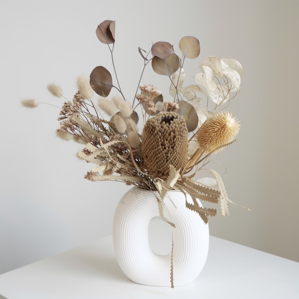 Modern Arrangement of Banksia, Preserved Eucalyptus and Limonium in hollow 16cm ceramic vase