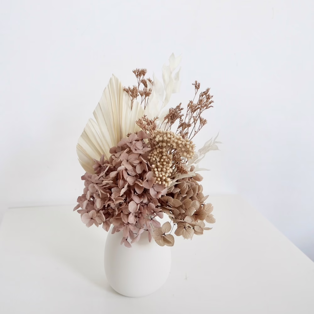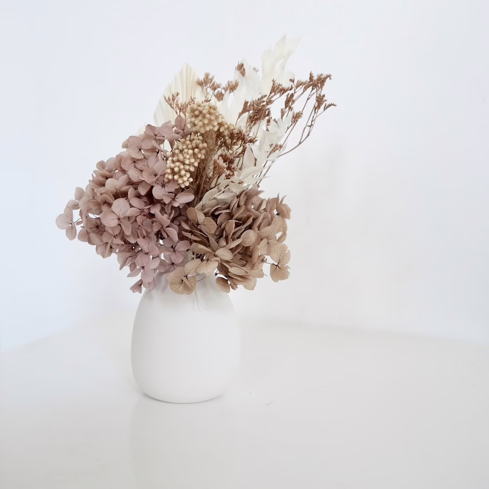 Preserved Hydrangea, Ruscus, Palm and Rice Flower and Gyp in 8cm white ceramic vase.
