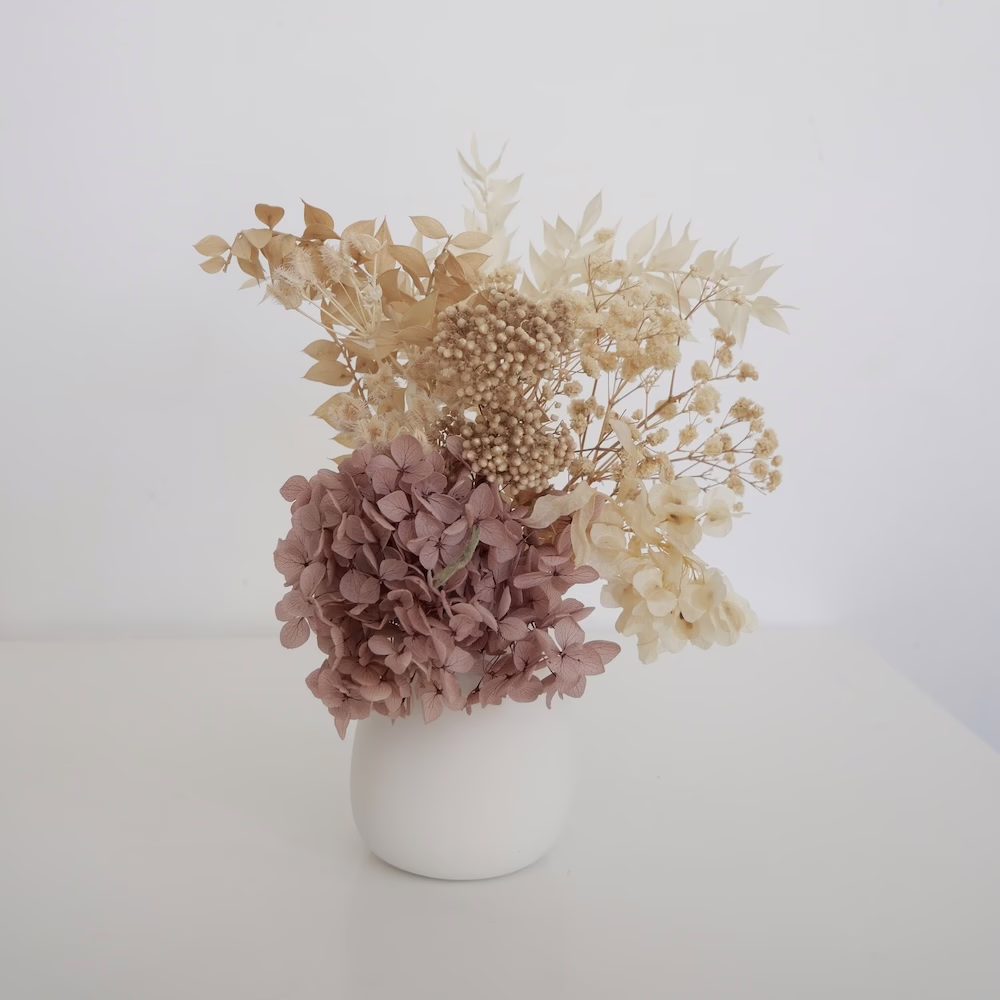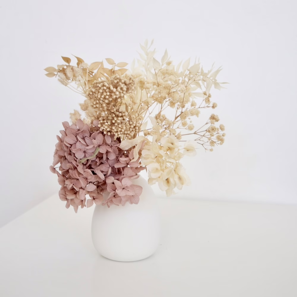 Preserved Hydrangea, Ruscus and Rice Flower and Gyp in 8cm white ceramic vase.