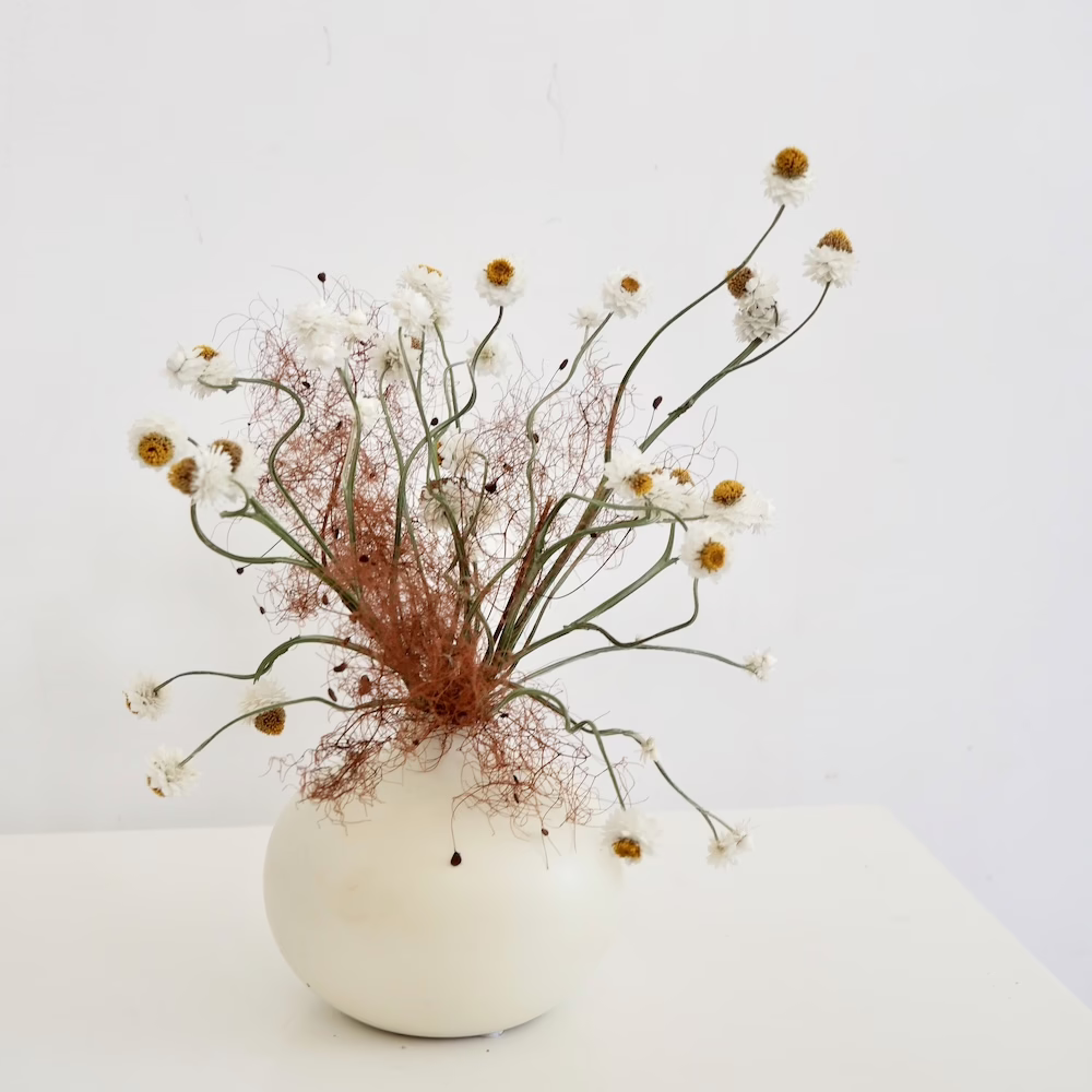 Small Arrangement with Dried Ammobium Daisy with Smokebush 10cm white ceramic vase.
