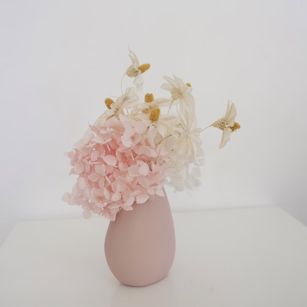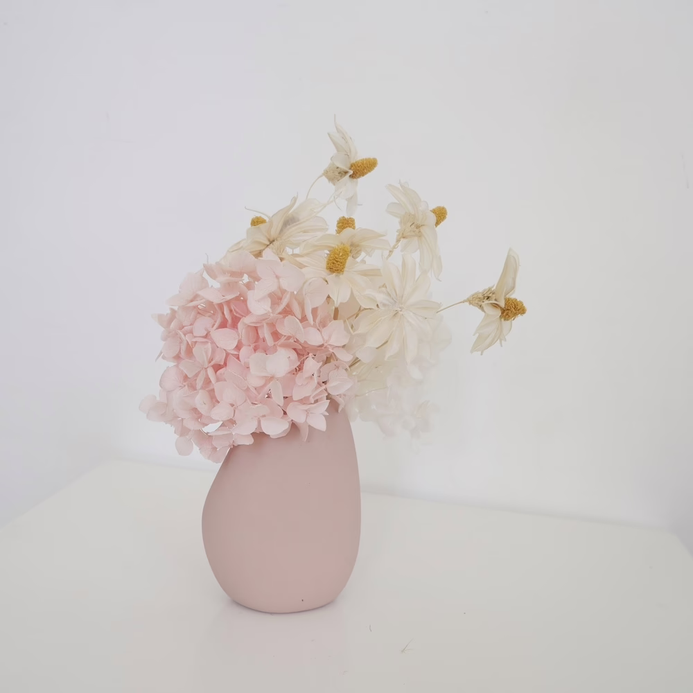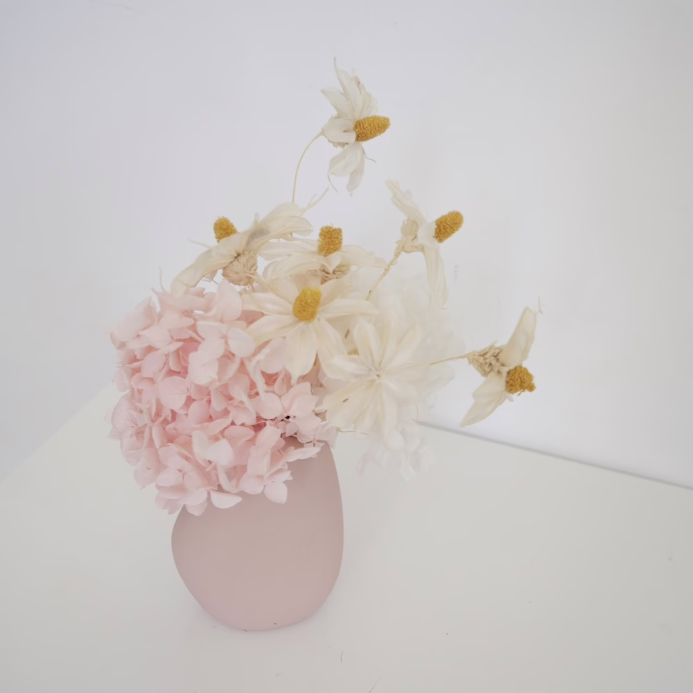 Preserved Hydrangea and handmade daisies in 8cm pink ceramic vase.