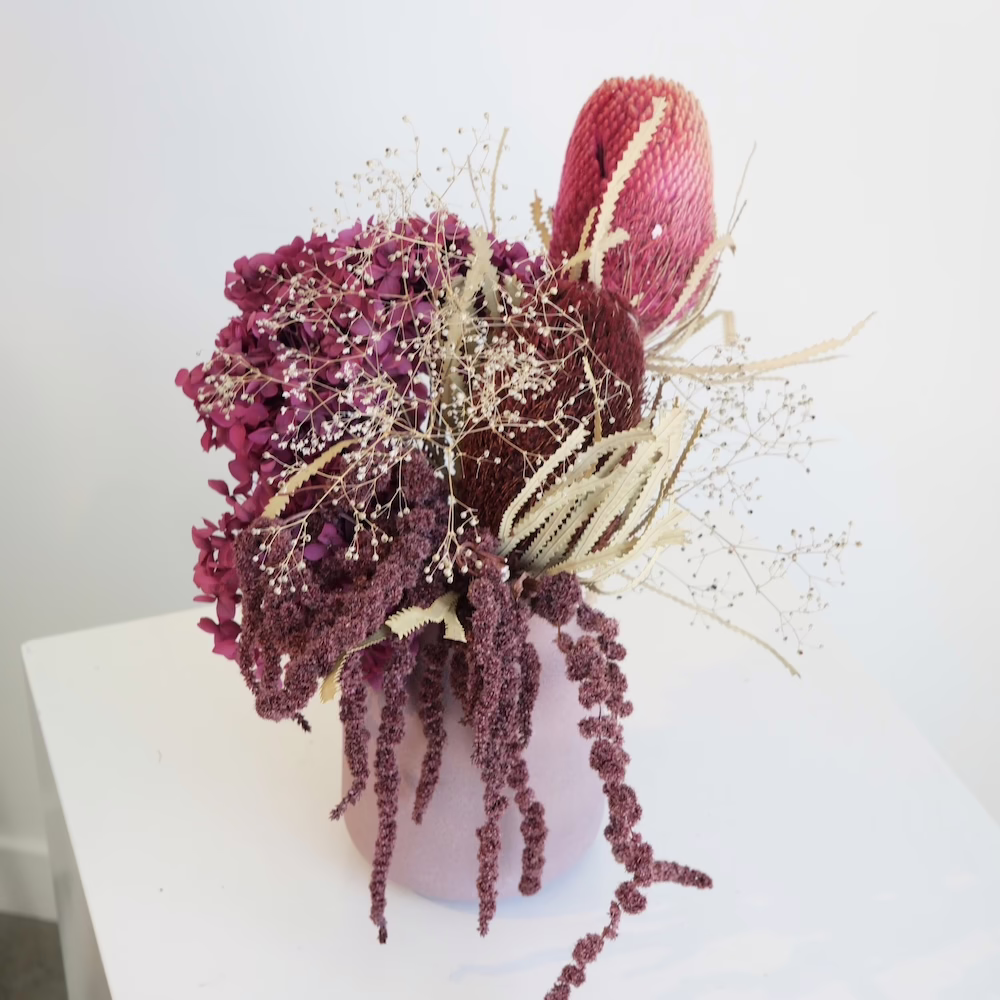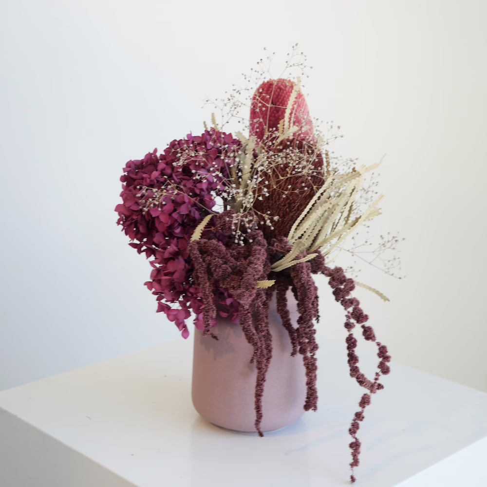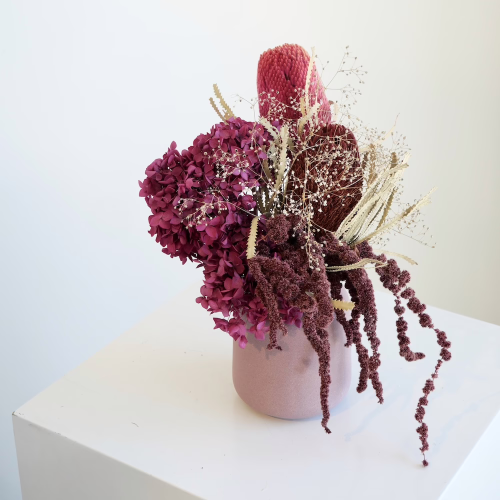 Preserved Hydrangea, Dried Banksia, Amaranths and Gyp in 15cm dusty pink ceramic vase