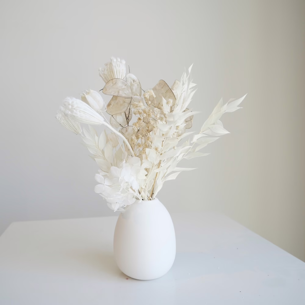 Preserved Queens Annes Lace in 8cm ceramic vase with Ruscus, Palm and Nigella.