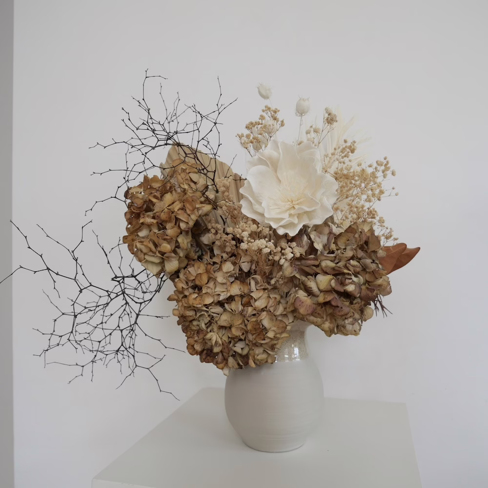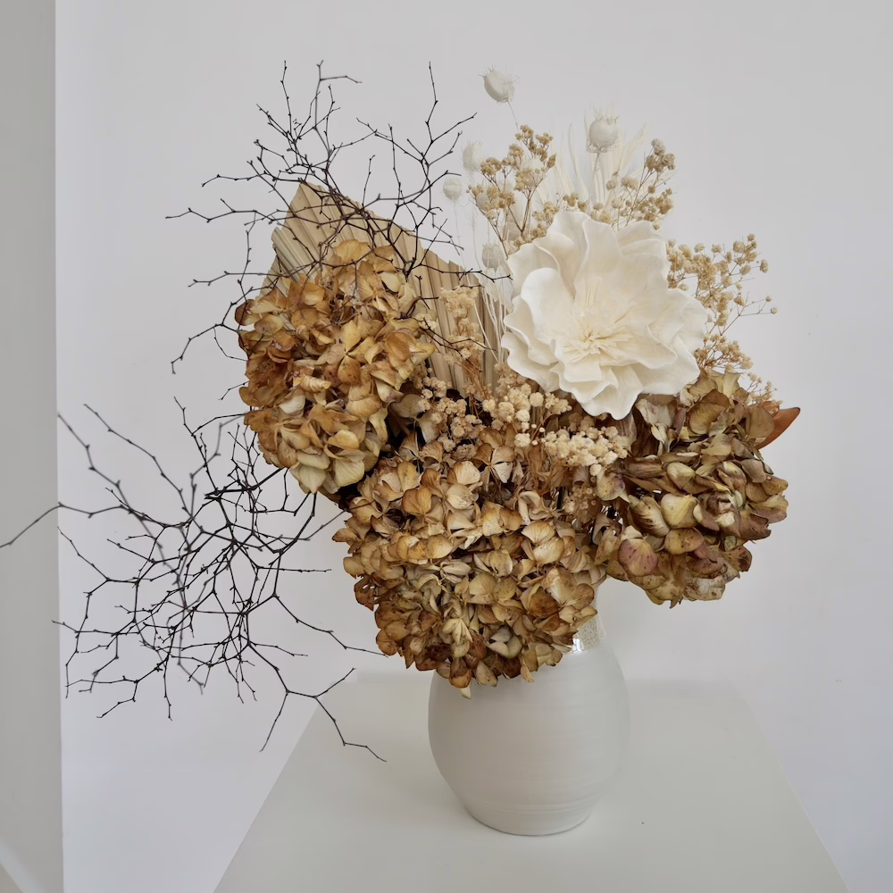 Arrangement with Dried Hydrangea, Gyp, Mulenbekia, Preserved Palm and stunning White Paper Magnolia in 20cm white/grey vase.